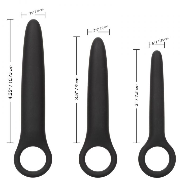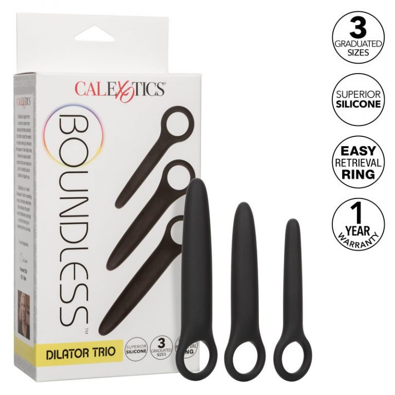 Expand your horizons of pleasure with the Boundless™ Dilator Trio. The seamless dilator set includes 3 graduated silicone dilators with easy finger loop and multi-use design. The sensually tapered probe and graduated size allow for gentle dilation. The premium silicone probes have a durable finger loop for gentle insertion and stimulation. The convenient loop can be paired with a mini bullet for intensified sensation! (bullet not included) The hypoallergenic premium silicone is body safe, unscented and phthalate free to keep you most sensitive spots, happy and healthy.