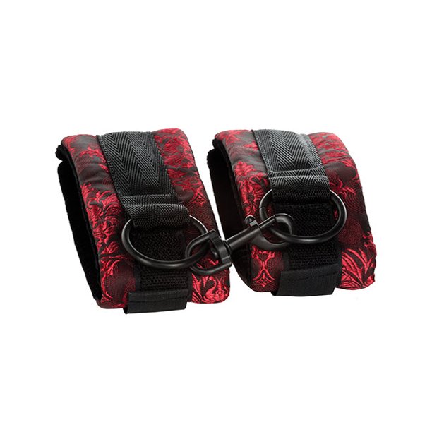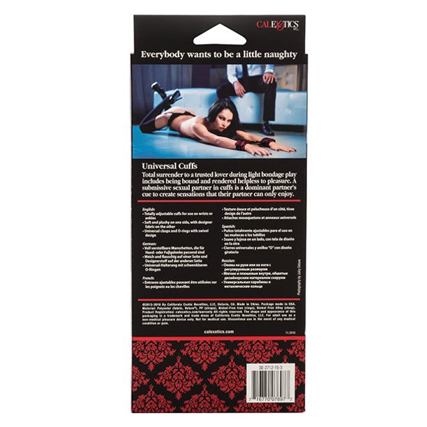 Do you crave a night where your lover takes full control of your body, where they use your body to fulfill their every desire or hold your arms above your head and tease you until you're beginning for release? If so, the Scandal® Universal Cuffs will take you there. These soft and plushy cuffs are covered in high-quality brocade fabric for a truly luxurious bondage experience.The cuffs are totally adjustable and come complete with Velcro style closures that can be used on wrists and ankles. Fasten them as loosely or as firmly as you desire. The universal clasps and nickel-free iron rings allow for endless creativity. Clasp the cuffs to each other and strain against their hold as your lover pleases you. Clamp them to the bed posts and embrace the bliss of totally relinquished control over your pleasure. Use two sets and let your lover render you totally helpless as they clasp your arms to your ankles and have their way with you.These are perfect for beginners and seasoned bondage lovers alike. Incorporate other toys and teases or keep things simple and experiment with being in total control for the first time. Whatever your tastes, take your fantasies to the next level.
