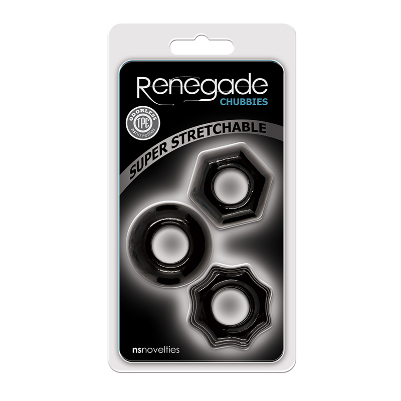 The Renegade Chubbies C-Ring Set is a versatile 3-pack of stackable TPE rings. Designed for comfort and stamina, these super-elastic rings can be worn individually or together for a custom fit. Includes Blue, Black, and Clear.