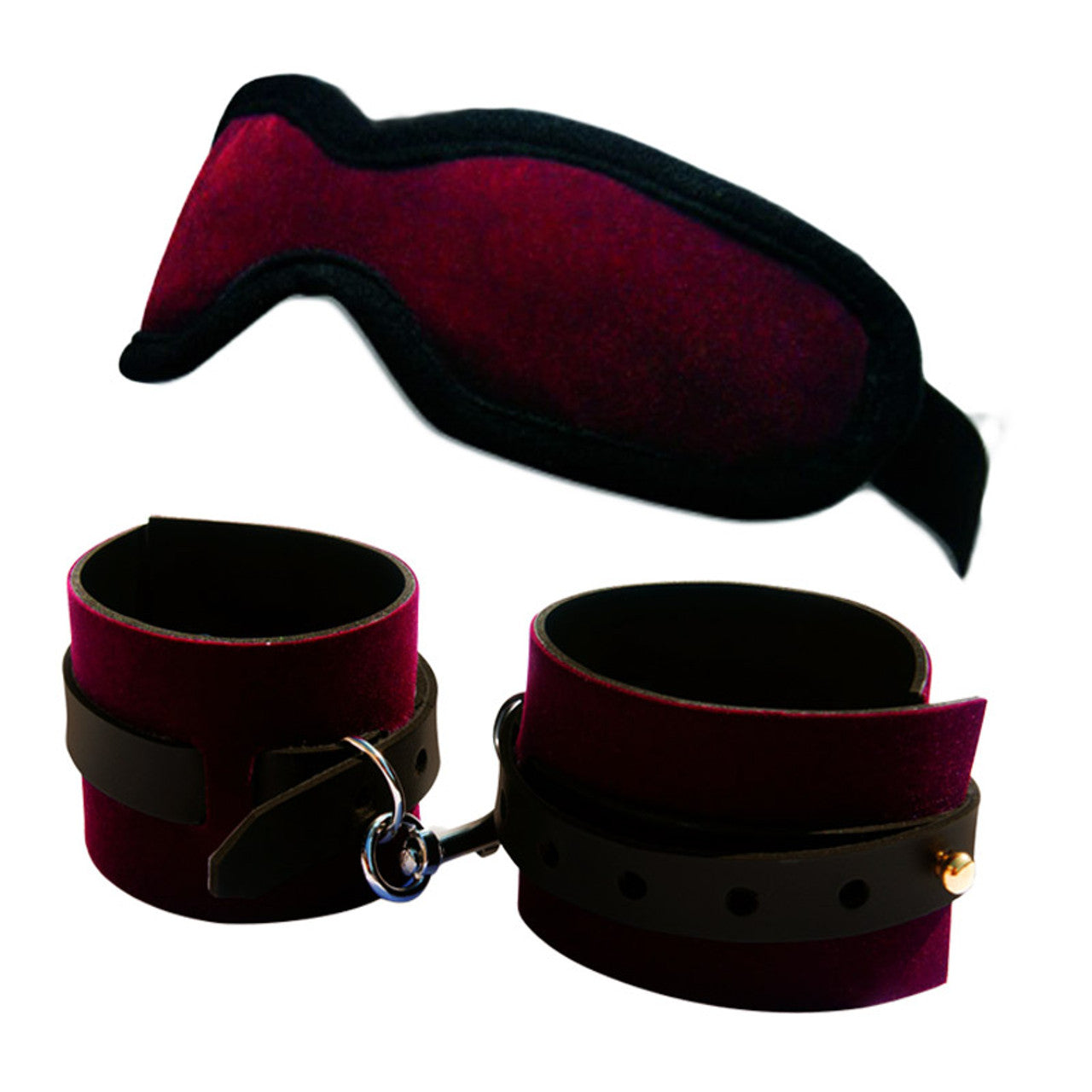 A burgundy blindfold with a full coverage shape and velvet feel, single elastic strap. One pair of