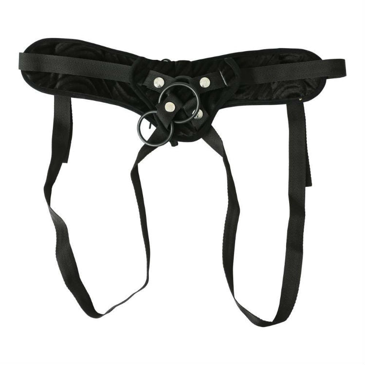 This beautifully styled harness is fashioned with a rear lace up tie up and comes buckled with adjustable straps suitable for anyone. This accessible kinky fashion item comes with plush velvet padding and includes a vibrating power bullet and interchangeable d-rings. Simply lock in your favourite dildo or replica cock dong (any toy with a flared base) that will firmly lock in.